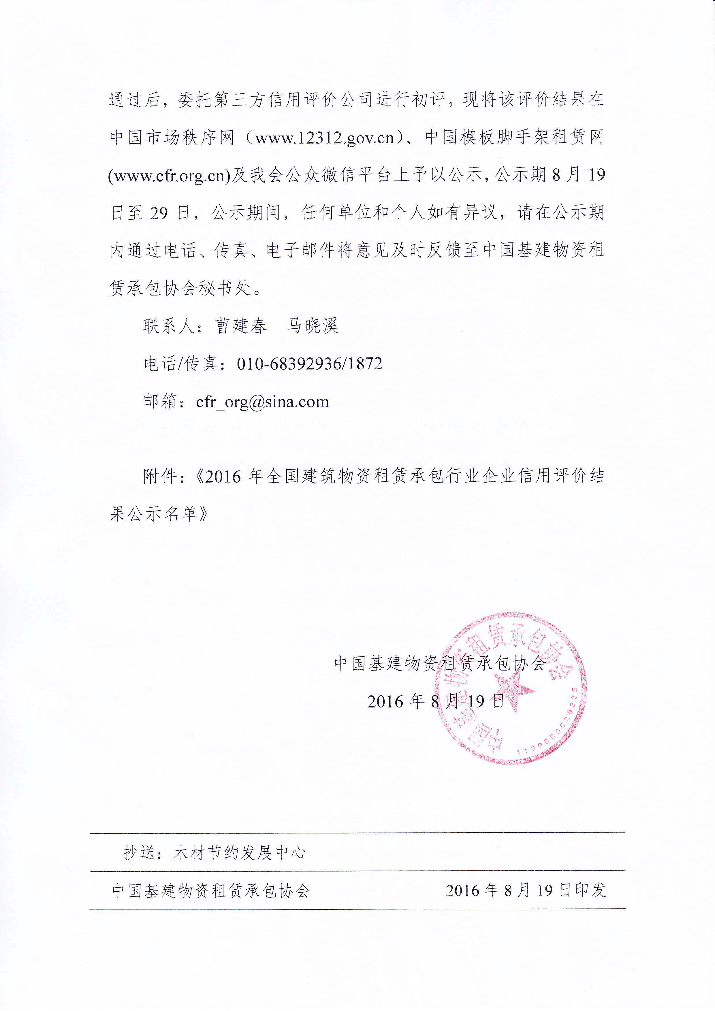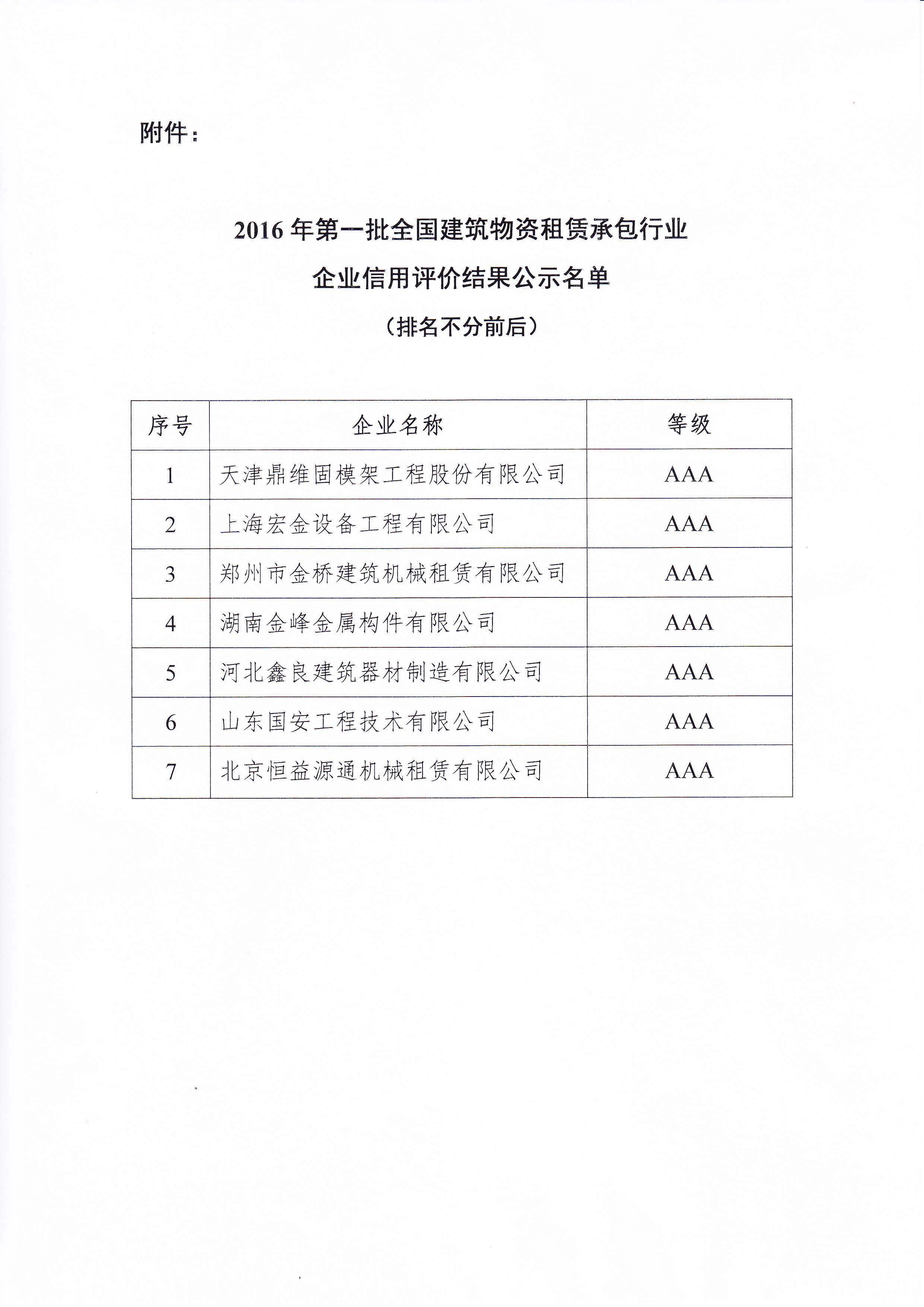 关于全国建筑物资租赁承包行业2016年第一批企业信用等级评价结果公示的通知