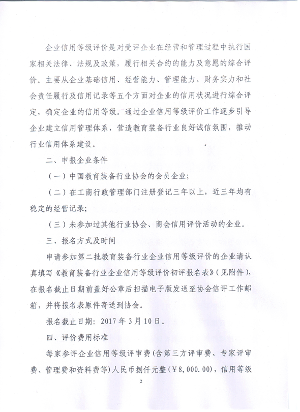 为全面推进教育装备行业信用体系建设,中国教育装备行业协会将继续开展第二批教育装备行业企业信用等级评价工作。现就有关事项通知如下:
