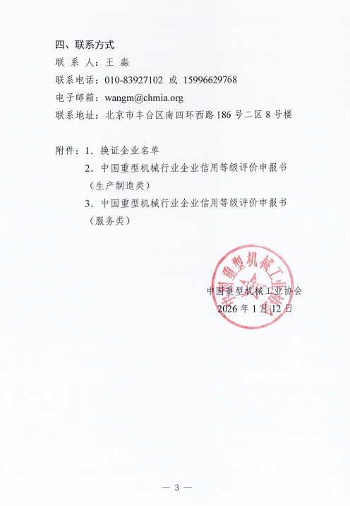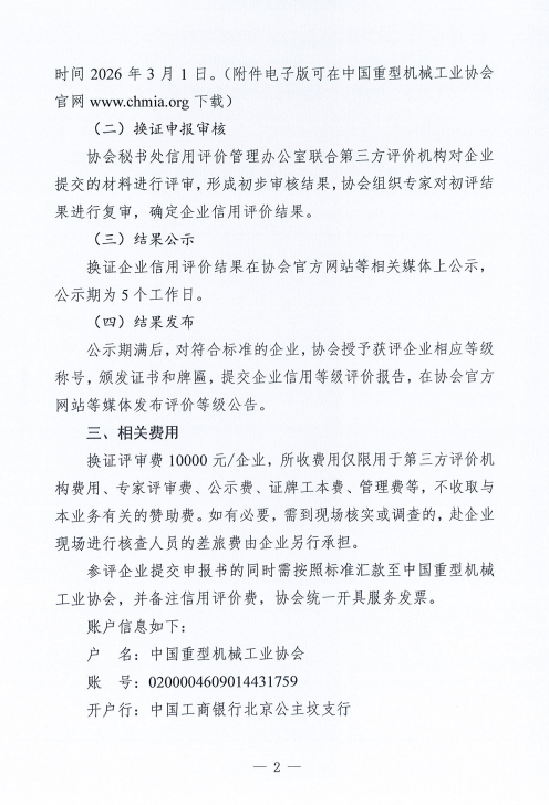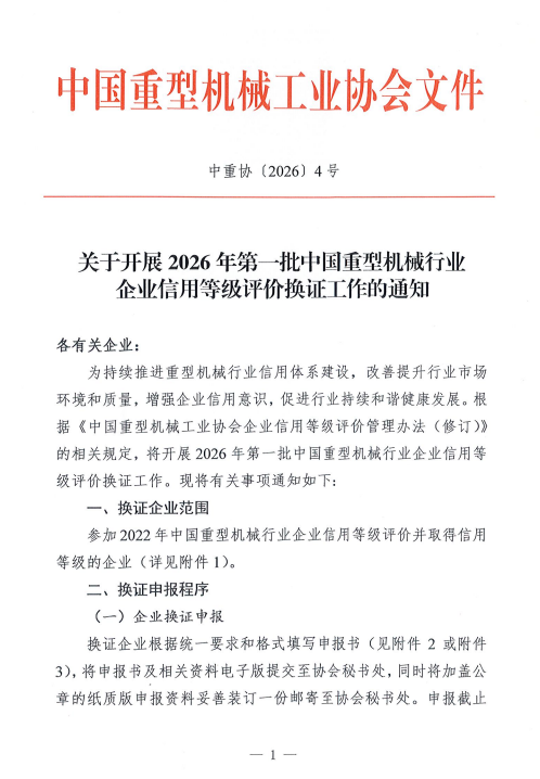 关于开展2026年第一批中国重型机械行业企业信用等级评价换证工作的通知